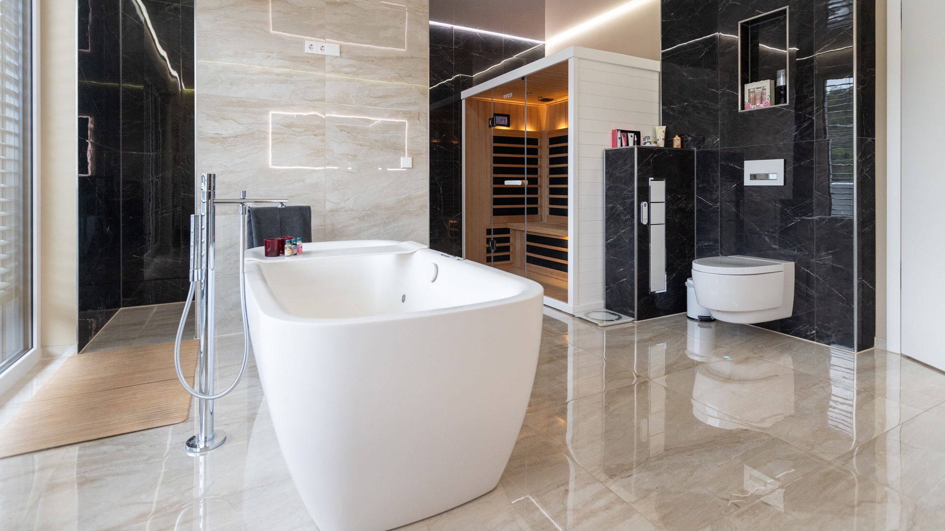 In diesem Neubau haben wir ein modernes Luxusbad mit freistehender Badewanne, Regenwalddusche und hochwertigen Fliesen gestaltet. Das Ergebnis ist eine stilvolle Wellnessoase mit edlen Design-Elementen.